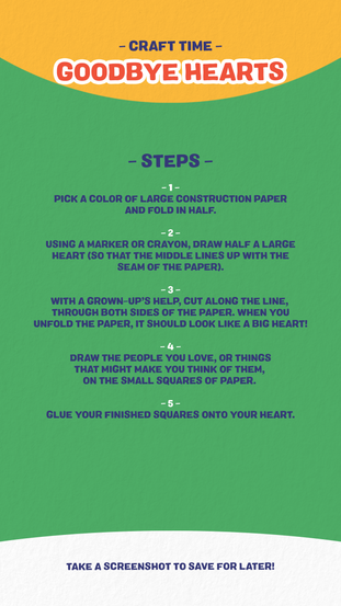 Goodbye HeartsDJ KhraftyApr 12, 20231 min readUpdated: Jun 20, 2023From Episode: 110Tags: Many Ways to Say Goodbye, Goodbye, Saying Goodbye, Card, Paper, Scissors, Glue, Crayons, MarkersDownload